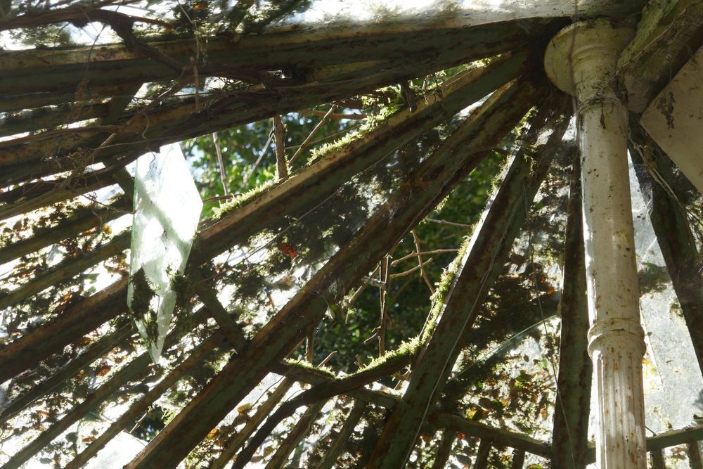 Ce jardin d'hiver au toit en deux pentes, en fer et verre avec des montants en fonte moulurée et décorée, présente de la corrosion et de nombreux verres doivent être remplacés.