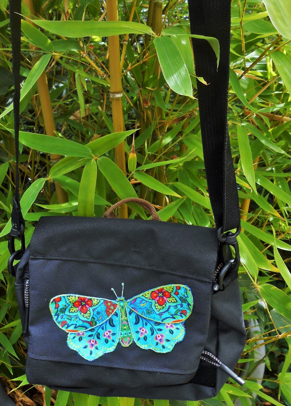 Pochette Décathlon . Appliqué et points de tige sur un tissu d'Odile Bailloeul -Collection India Song .